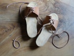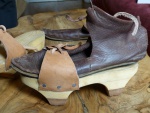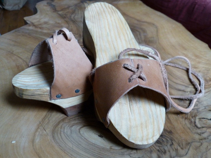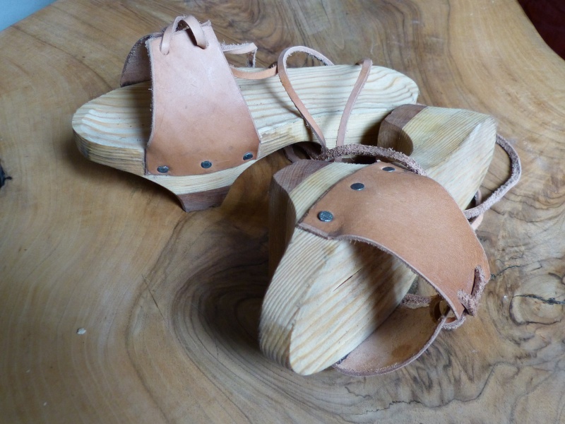 Le corps de ces socques est en peuplier pour la légèreté. Une couche d'usure en chêne a été ajoutée en semelle pour augmenter leur durée de vie. La lanière de cuir permet le réglage des sangles en fonction de la chaussure. Le nœud se fait derrière le talon afin d'empêcher les socques de "s'enfuir" lors d'une marche rapide ou d'une course.