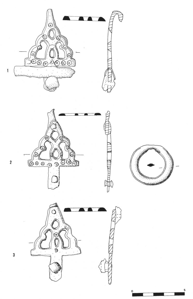 « La morphologie des agrafes de ceinture d’Ensérune est semblable à celle des exemplaires provenant d’autres régions, seules des différences importantes sont à noter quant aux dimensions et quant à la forme des pleins et des vides (formant les motifs décoratifs). Les différentes parties constitutives sont les mêmes ; crochet, corps de l’agrafe, base et patte de fixation12. Les agrafes de ceinture d’Ensérune sont nettement plus massives que les agrafes champenoises. Le système d’attache ne diffère que par la gouttière qui enserre l’extrémité de la lanière de cuir ou de tissu sur ses trois côtés. On peut supposer d’ailleurs que les agrafes étant plus massives et larges, la lanière devait l’être également, nécessitant éventuellement un système d’attache plus solide. »