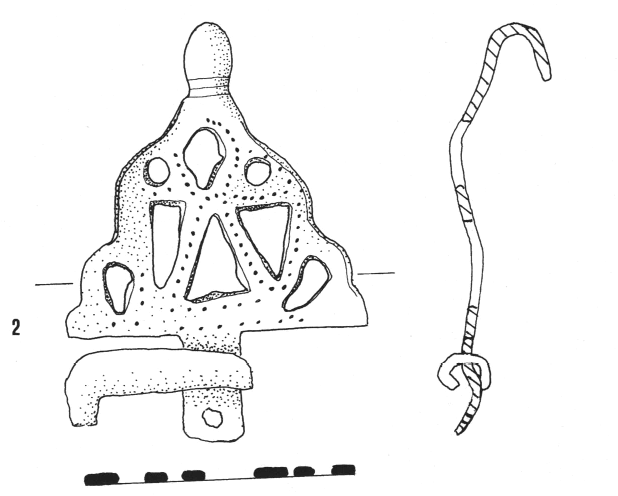 « La morphologie des agrafes de ceinture d’Ensérune est semblable à celle des exemplaires provenant d’autres régions, seules des différences importantes sont à noter quant aux dimensions et quant à la forme des pleins et des vides (formant les motifs décoratifs). Les différentes parties constitutives sont les mêmes ; crochet, corps de l’agrafe, base et patte de fixation12. Les agrafes de ceinture d’Ensérune sont nettement plus massives que les agrafes champenoises. Le système d’attache ne diffère que par la gouttière qui enserre l’extrémité de la lanière de cuir ou de tissu sur ses trois côtés. On peut supposer d’ailleurs que les agrafes étant plus massives et larges, la lanière devait l’être également, nécessitant éventuellement un système d’attache plus solide. »