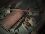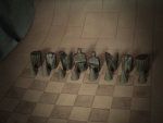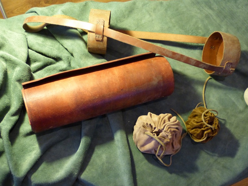 - Un jeu d'échec: copie du jeu retrouvé à Noyon et daté du XIIème siècle. Son plateau est réalisé par repoussage au centre de la pièce de cuir. Les pièces sont en bois sculpté à la main, les blancs sont réalisés en buis, et les noirs en ébène.