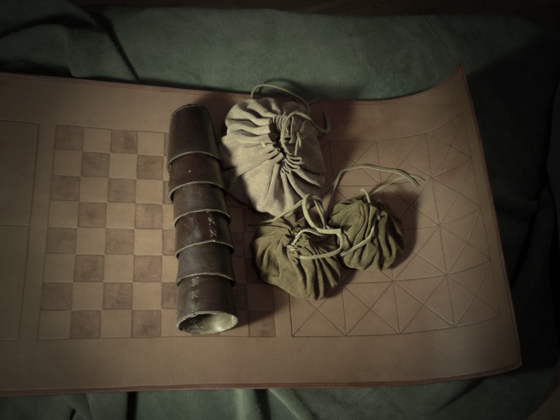 - Un alquerque : Son plateau est réalisé par repoussage sur la partie gauche de la pièce de cuir. Les pions blancs sont en corne blanche, les pions noirs en corne noire.